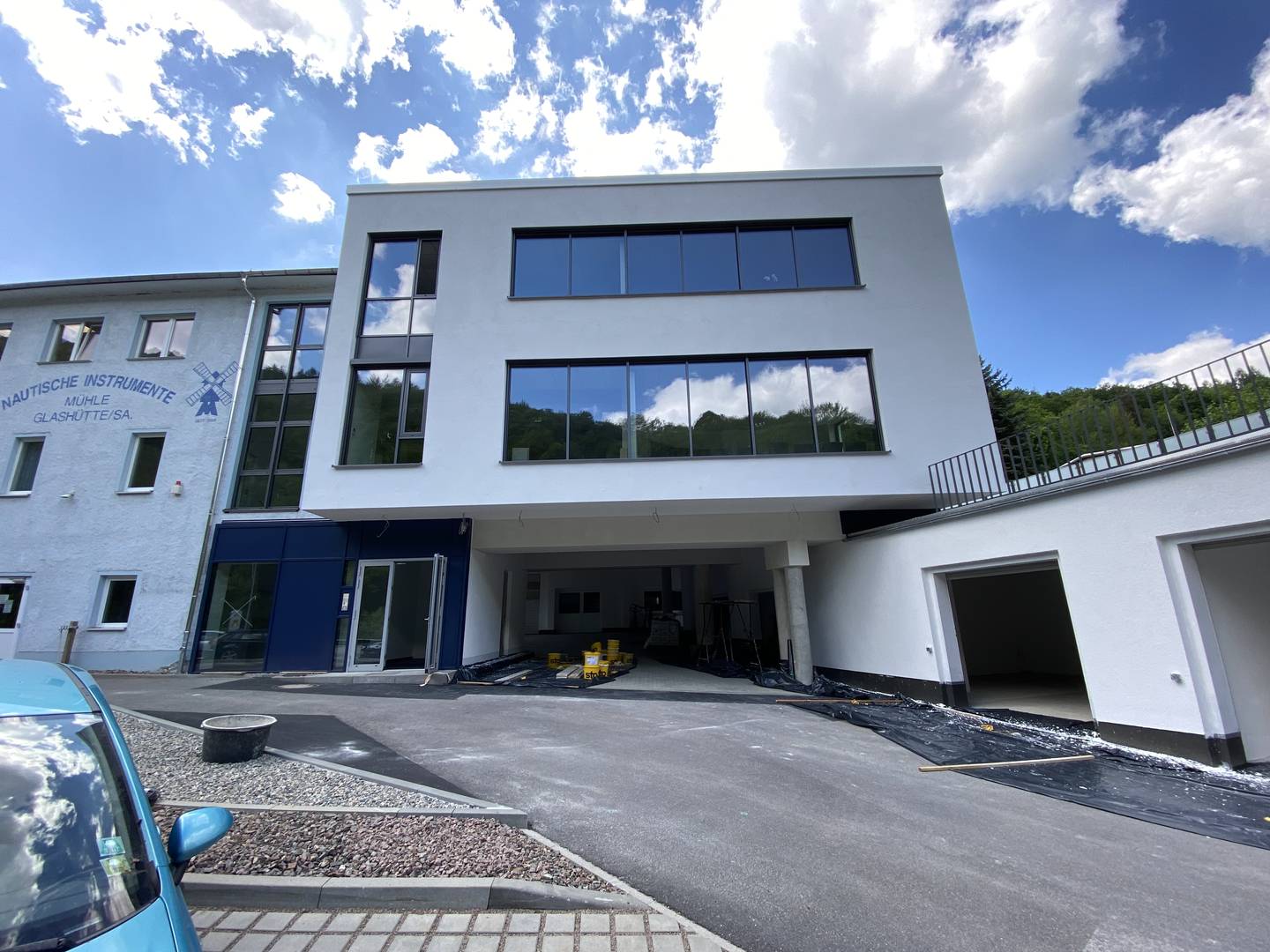 Der Erweiterungsbau für die Fa. Mühle , Nautische Instrumente in Glashütte war eine gestalterische, konstruktive und organisatorische Herausforderung für uns. Das Bauwerk mußte an 4 bestehende Gebäude angeschlossen werden und bildet nunmehr die Verbindung zwischen Ihnen. Außerdem mußte die Hofebene komplett nutzbar bleiben, was zur Aufständerung des Komplexes führte.